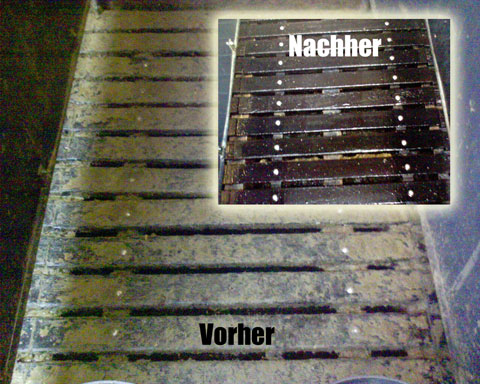 und die Fugen für den Wasserablauf freigelegt Fassadenreinigung